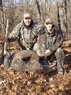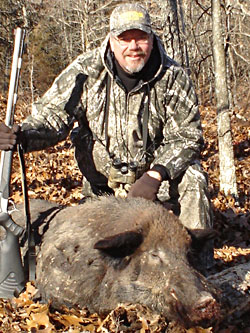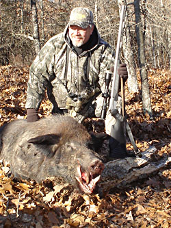 The boar continued to feed down the hill. My crosshairs never left his chest. At about 30-yards I heard Jason whisper, "Shoot!" Smoke filled the air as my Pro Hunter belched out the HORNADY bullet. The slug hit its mark and the giant boar went only 40-yards.